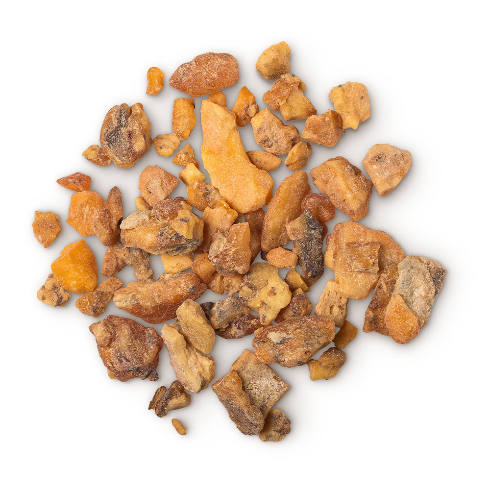 Benzoin is a natural resin that can be collected from two types of styrax trees: Styrax benzoin, native to Sumatra, and Styrax tonkinensis, which grows in Southeast Asia. Although often referred to as gums, resins are slightly different, as they contain many more essential oils and are not soluble in water. When they're injured, it flows off tree trunks and hardens with air exposure, like a bandage protecting the tree from disease. Once collected, the hard resin can be ground into a powder or refined with solvents to make a scented extract called a resinoid.